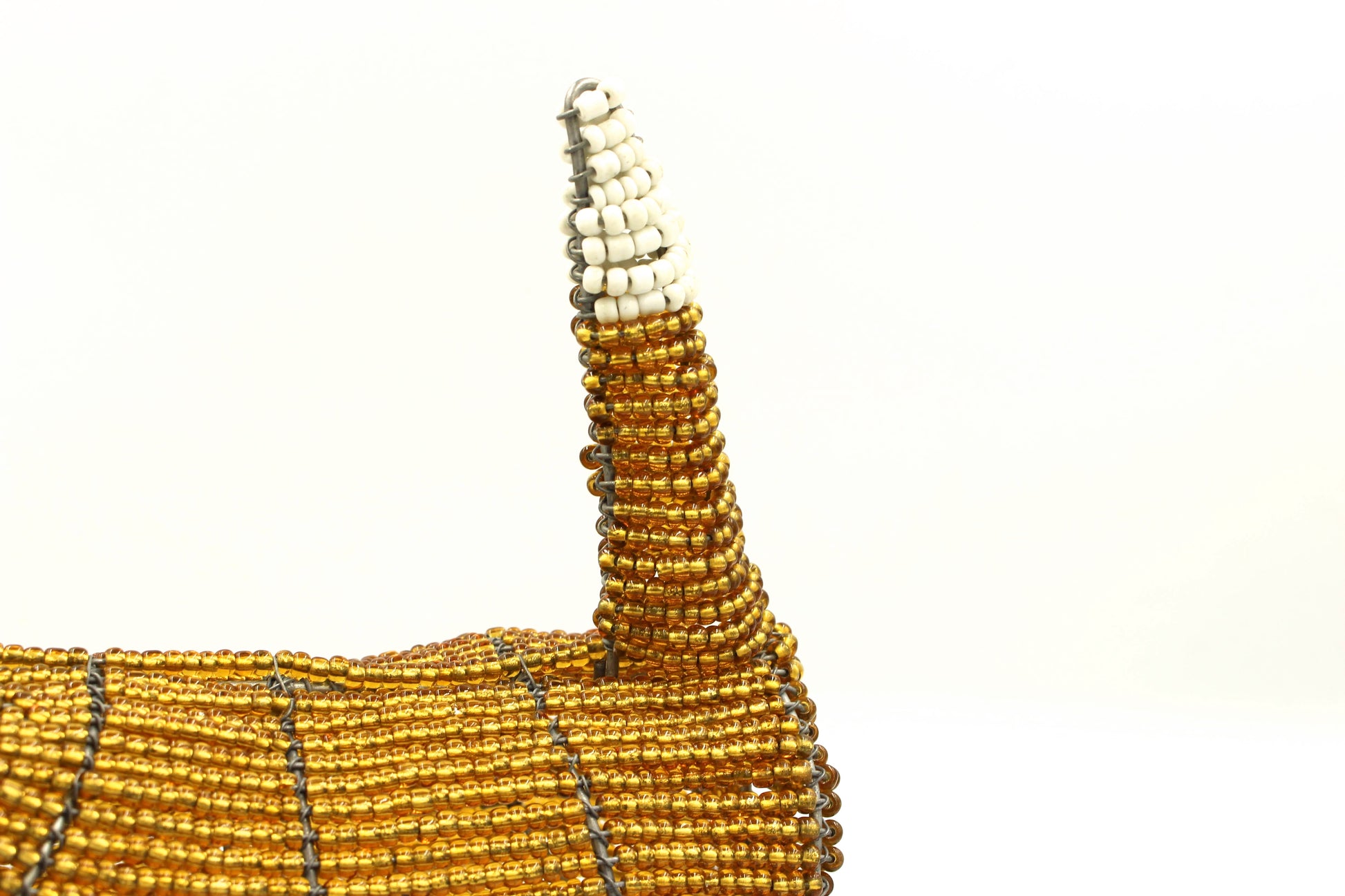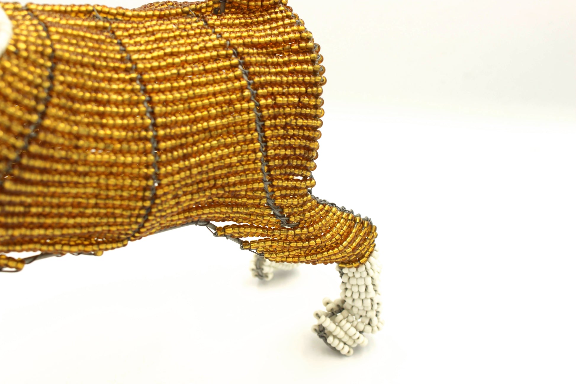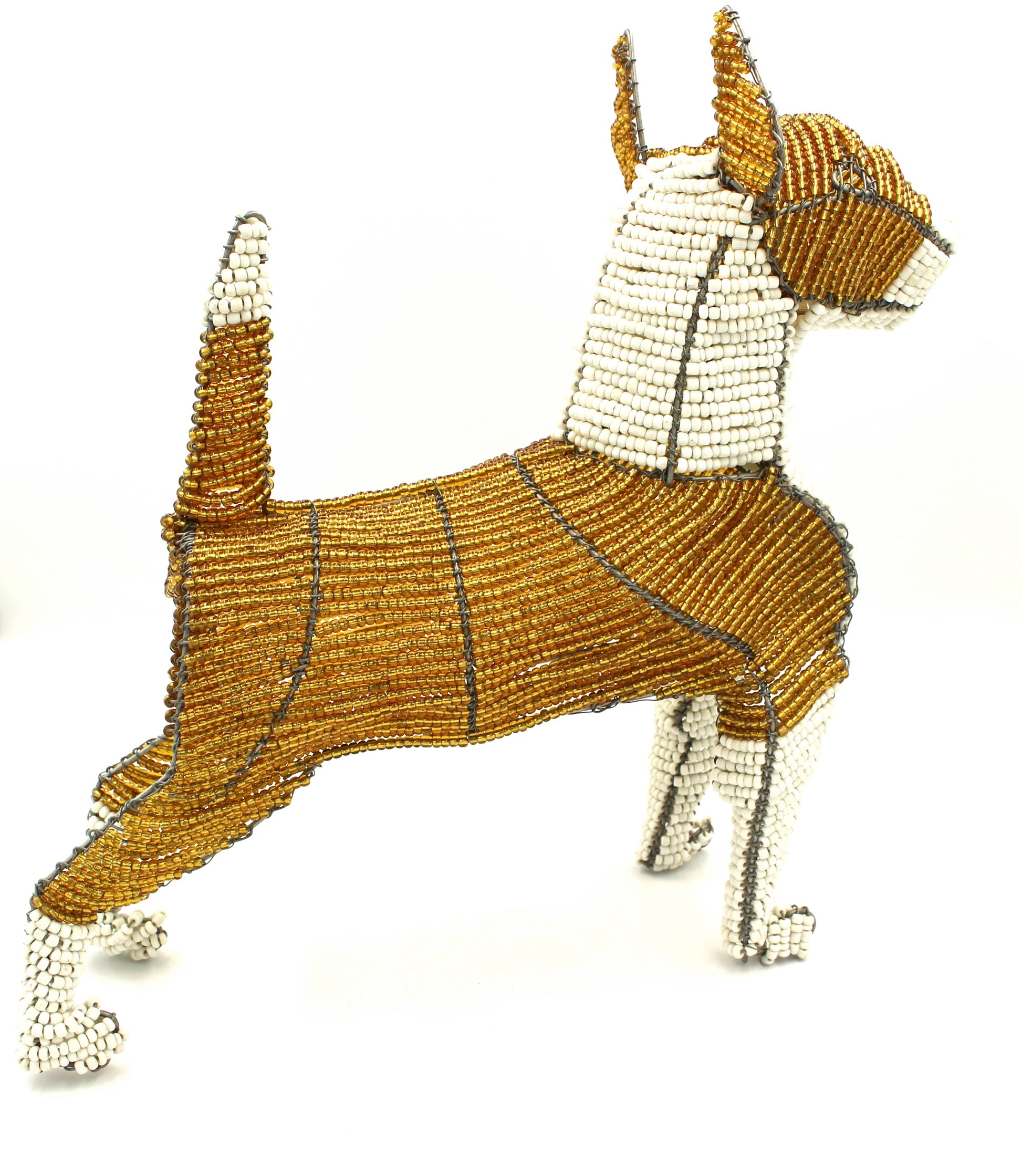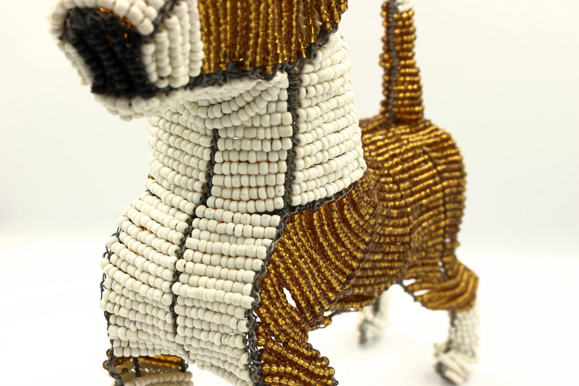 Beautifully hand-beaded large brindle and white Bull Terrier.