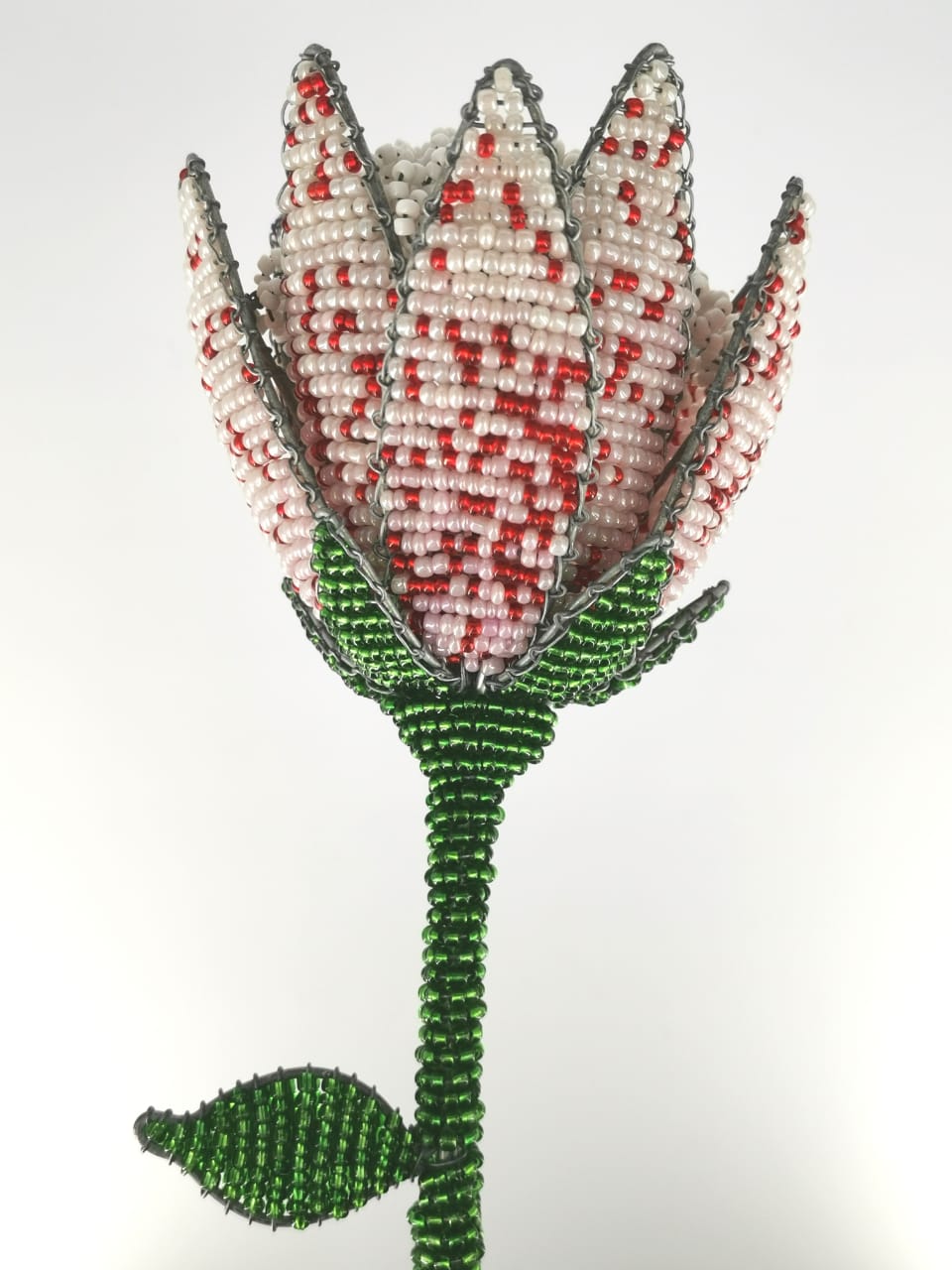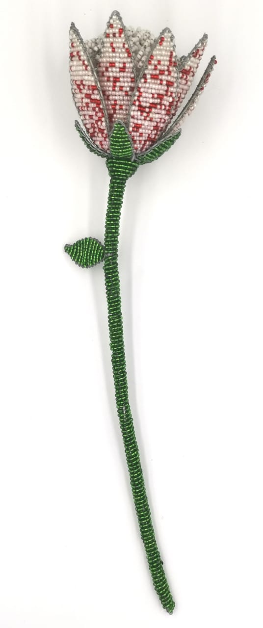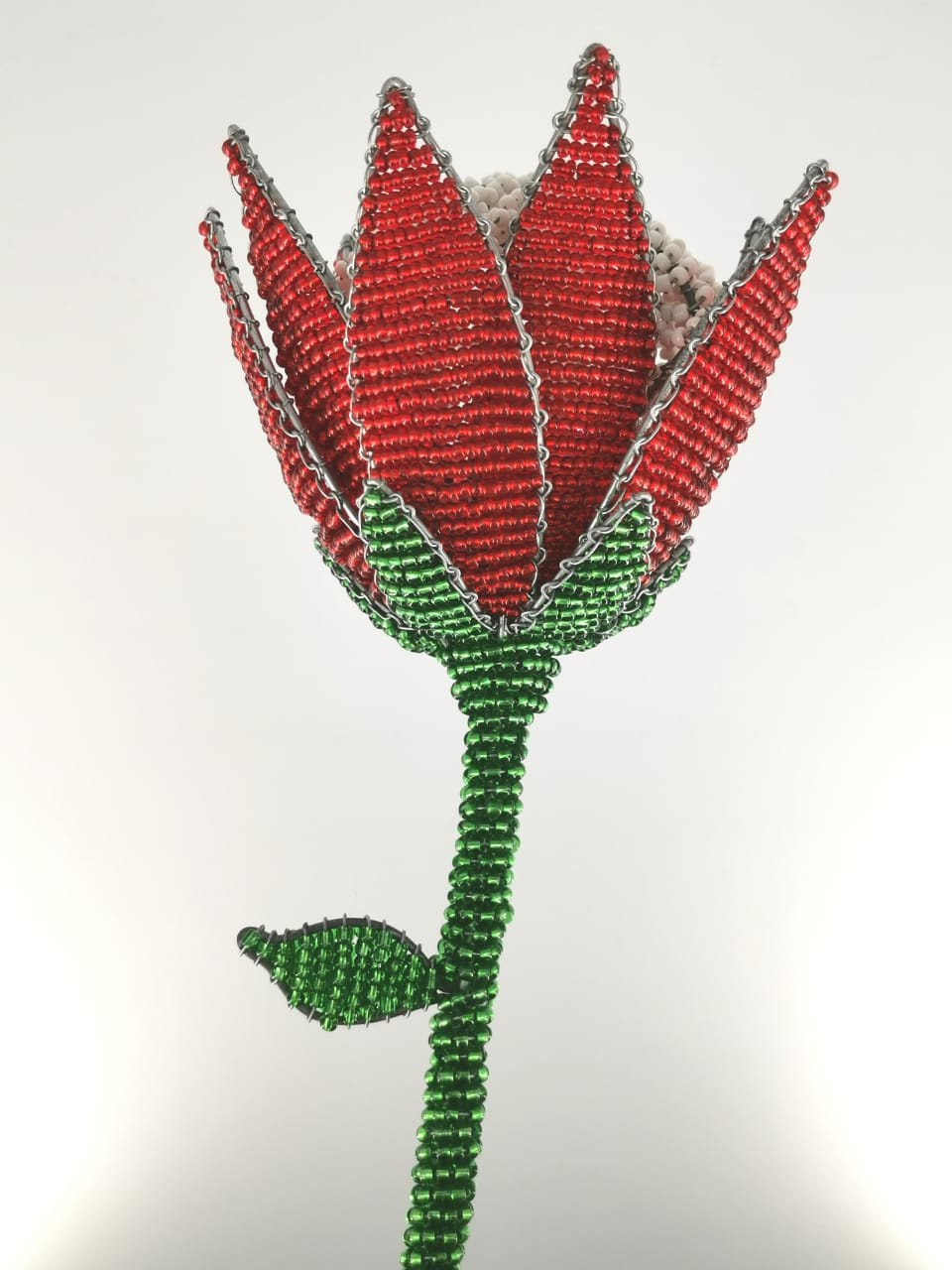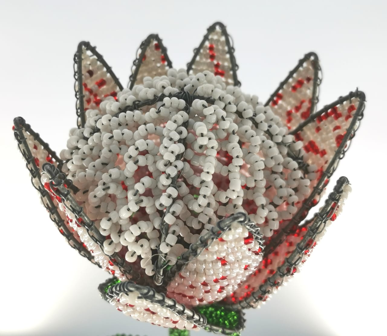 The attention to detail is truly impressive, with every petal and leaf carefully crafted from thousands of tiny beads. The centre of the flower is adorned with a cluster of beads that add texture and dimension to the design.