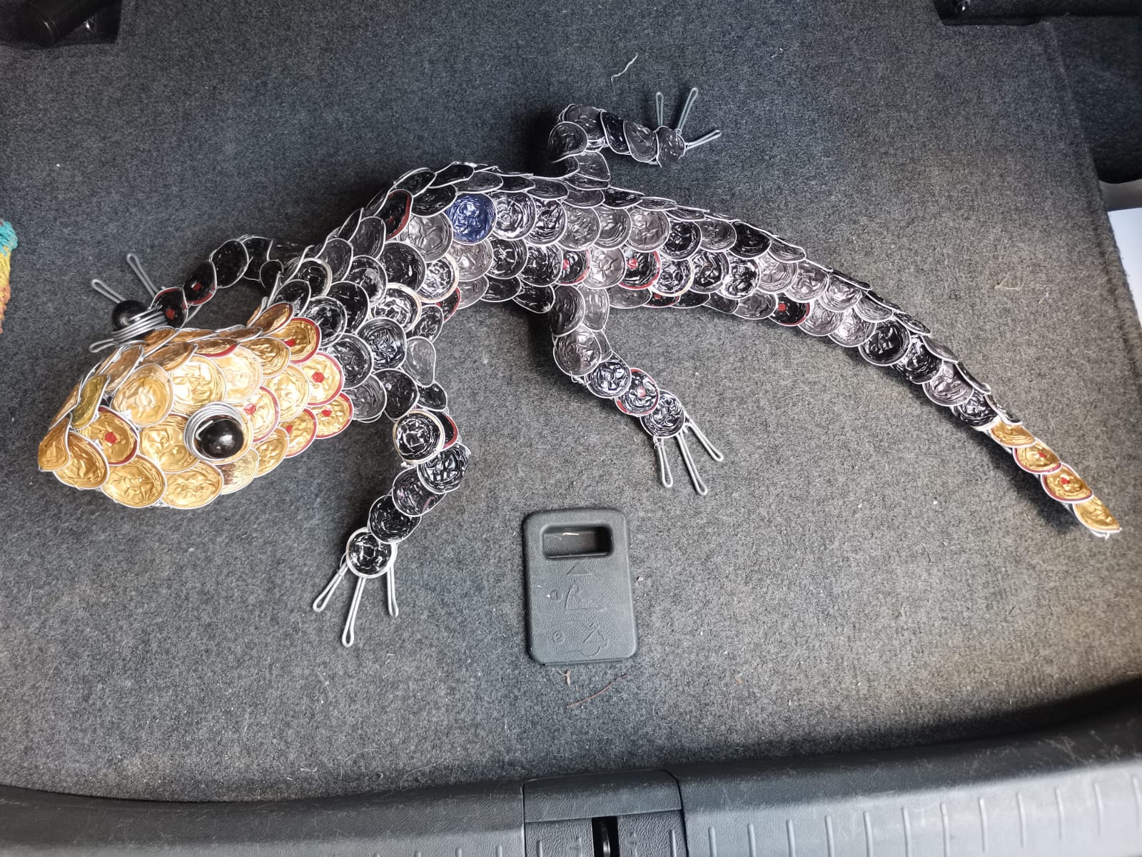 Stunning handmade gecko sculpture made from wire and recycled coffee pods. Two colours making this piece incredibly eye-catching. Made to hang on a wall.