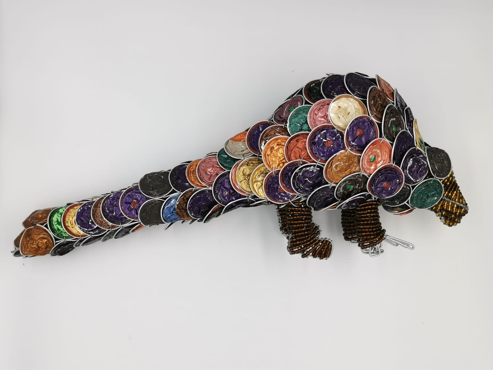 Each Pangolin is handcrafted by skilled artisans who have repurposed discarded coffee pods, transforming them into a delightful and durable playmate. The outer layer of the Pangolin is covered in an intricately woven layer of recycled coffee pods that provides both texture and visual interest.
